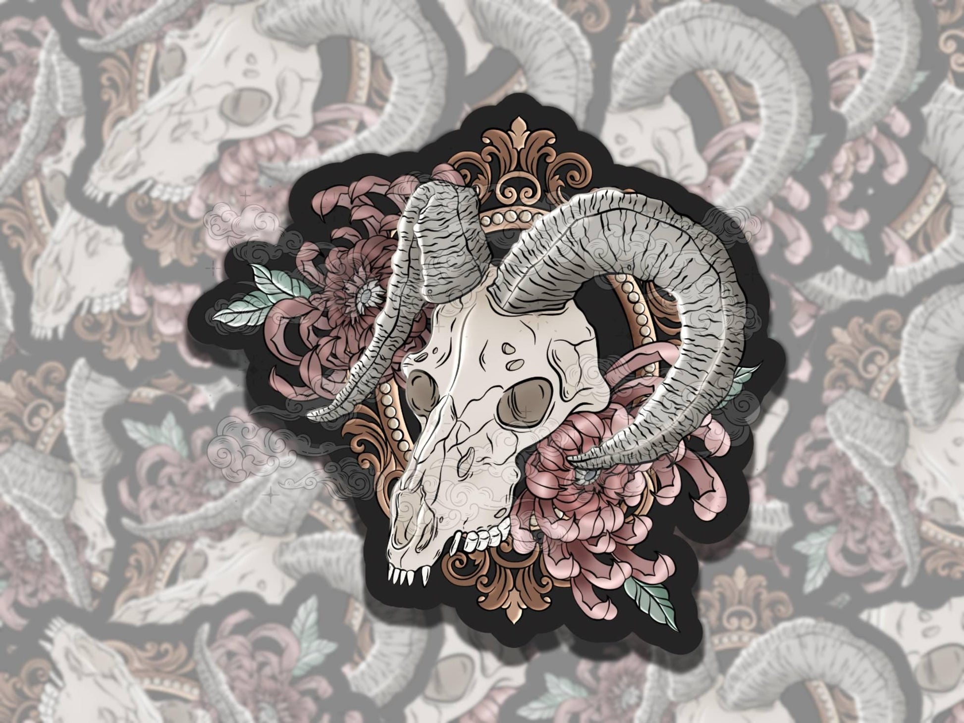 Horned Skull Frame Whimsigoth Waterproof Vinyl Sticker, Girly Gift for Friend, Funny Sticker for Kindle Laptop Water Bottle Journal