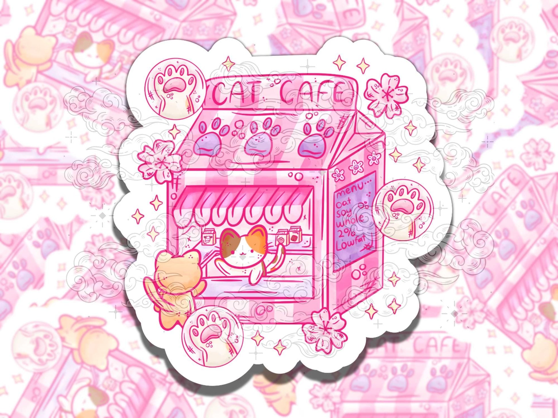 Kitty Cafe Cute Kawaii Waterproof Vinyl Sticker, Gift for Friend Cat Lover, Funny Sticker for Kindle Laptop Water Bottle Journal