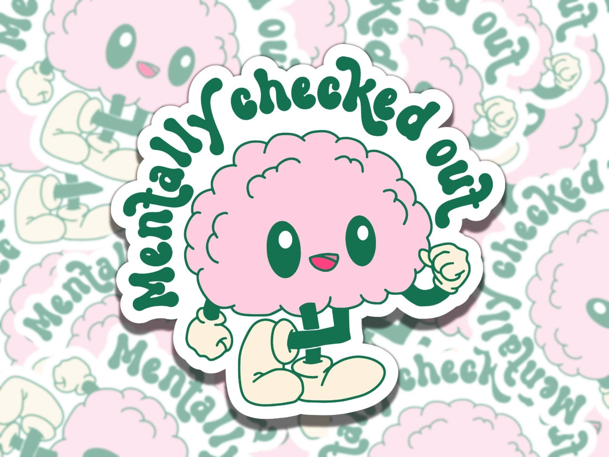Mentally Checked Out Cute Pink Brain Mental Health Affirmation Sticker, Gift for Friend, Waterproof Sticker for Kindle Laptop Water Bottle