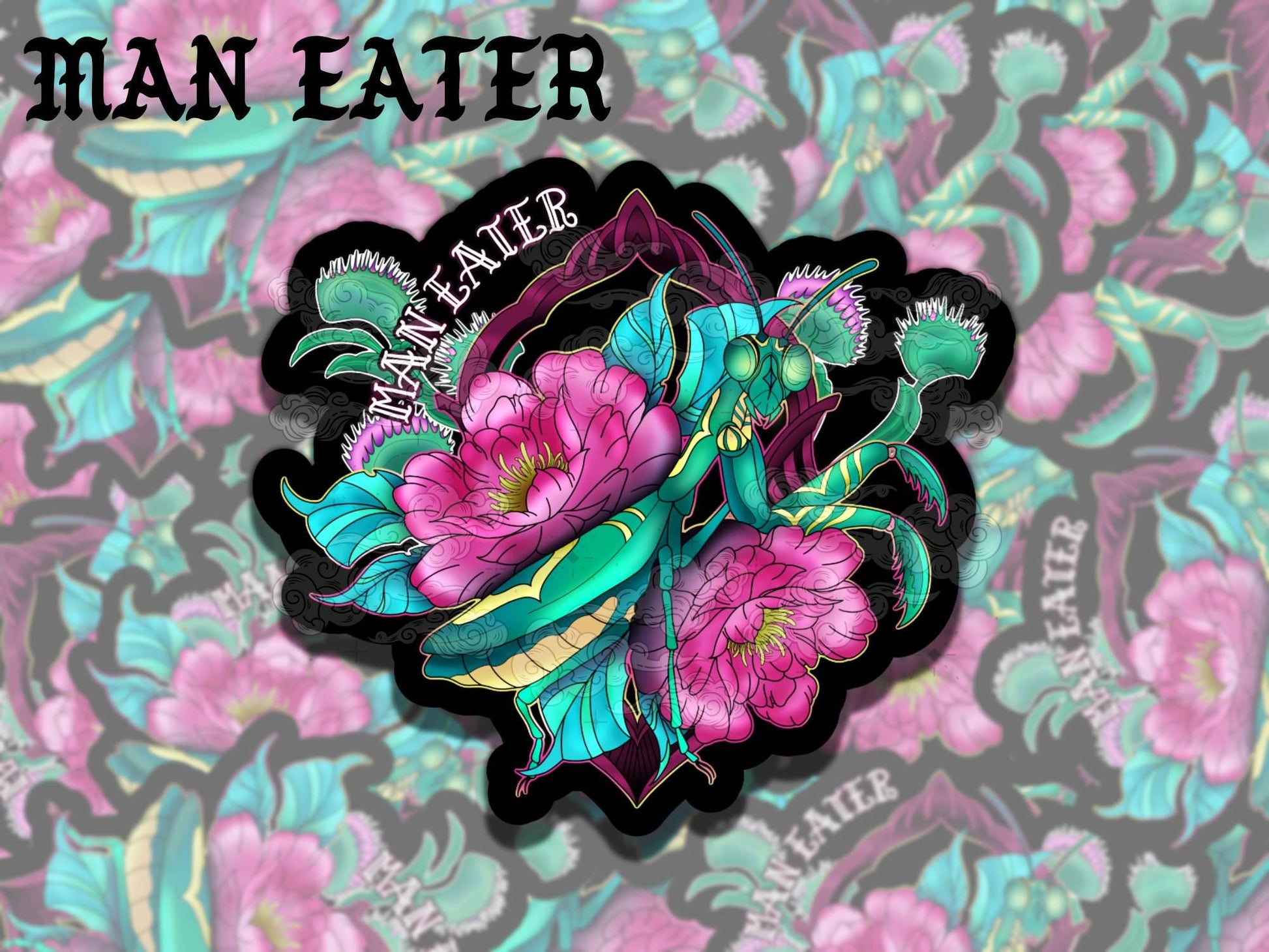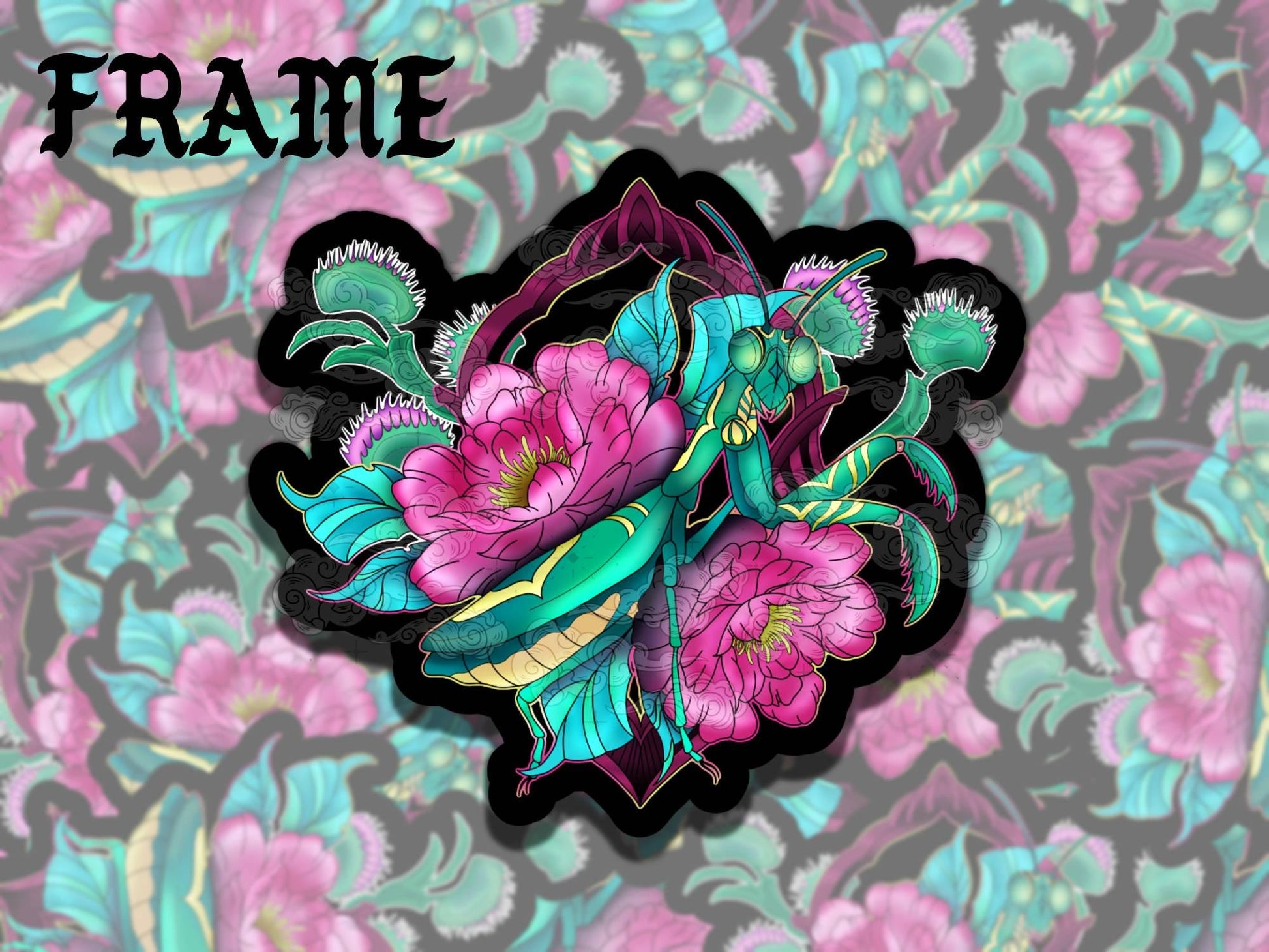 Neotraditional Mantis Tattoo Waterproof Vinyl Sticker, Girly Gift for Friend, Funny Sticker for Kindle Laptop Water Bottle Journal