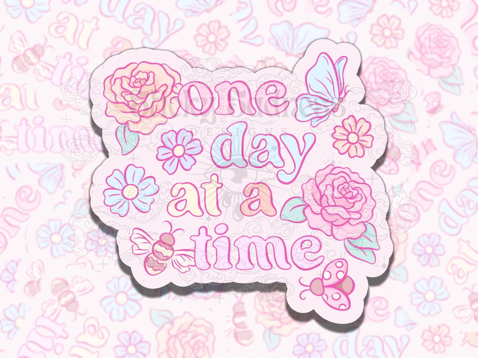One Day at a Time Pink Fun Cute Girly Waterproof Vinyl Sticker, Gift for Girl Friend, Funny Sticker for Kindle Laptop Water Bottle Journal