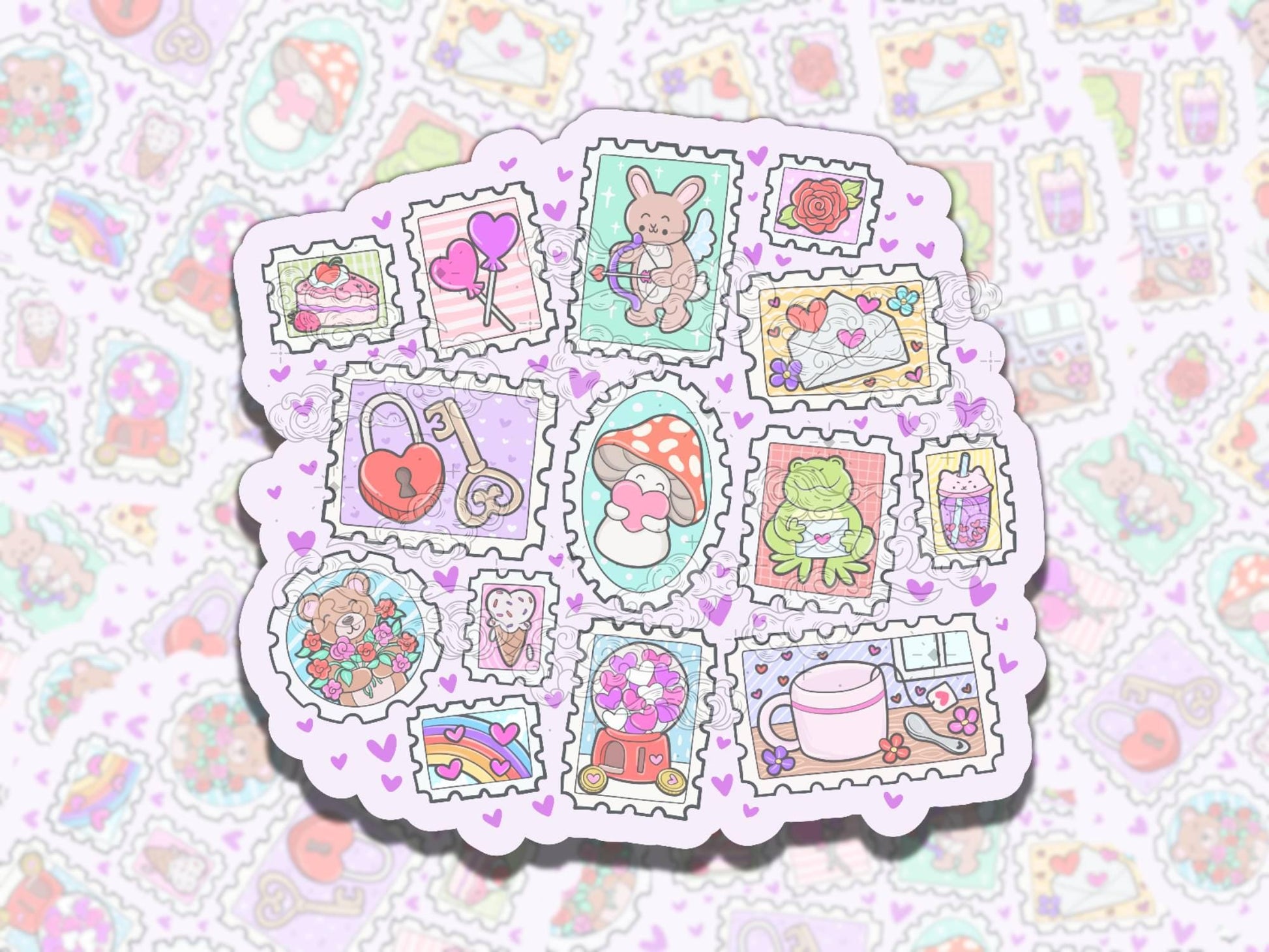 Valentine's Stamps Frog Pink Holiday Waterproof Vinyl Sticker, Gift for Girl Friend, Funny Sticker for Kindle Laptop Water Bottle Journal